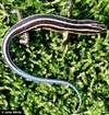 Eumeces fasciatus gains its common name from the five yellow to cream equant stripes running from their snout to their tail. Adults typically are drab aside from these lines (and males usually lose them altogether), but juveniles have a bright blue tail. This is thought to draw the attention of predators, which will attack the detachable (autotomous) tail while the animal escapes. |