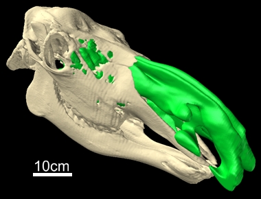 The specimen was scanned (120.0 kV, 200.0 mA, 5 mm slice thickness, bone algorithm) on 21 May 2002 on a GE HiSpeed Fx-i Helical CT Scanner at O'Bleness Memorial Hospital, Athens, Ohio with the assistance of Heather D. Mayle, RT. The head was then injected (according to procedures modified from Sedlmayr & Witmer, 2002) and re-scanned on 23 May 2002, using the same equipment, settings and personnel. CT data were exported in DICOM format using eFilm (v. 1.5.3, Merge eFilm, Tonoto). Analysis and postprocessing employed eFilm (v. 1.8.3) and Amira (v. 3.0, TGS, Inc., San Diego). Quicktime (v. 6.0, Apple Computer, Inc., Cupertino) was used to make the movies.